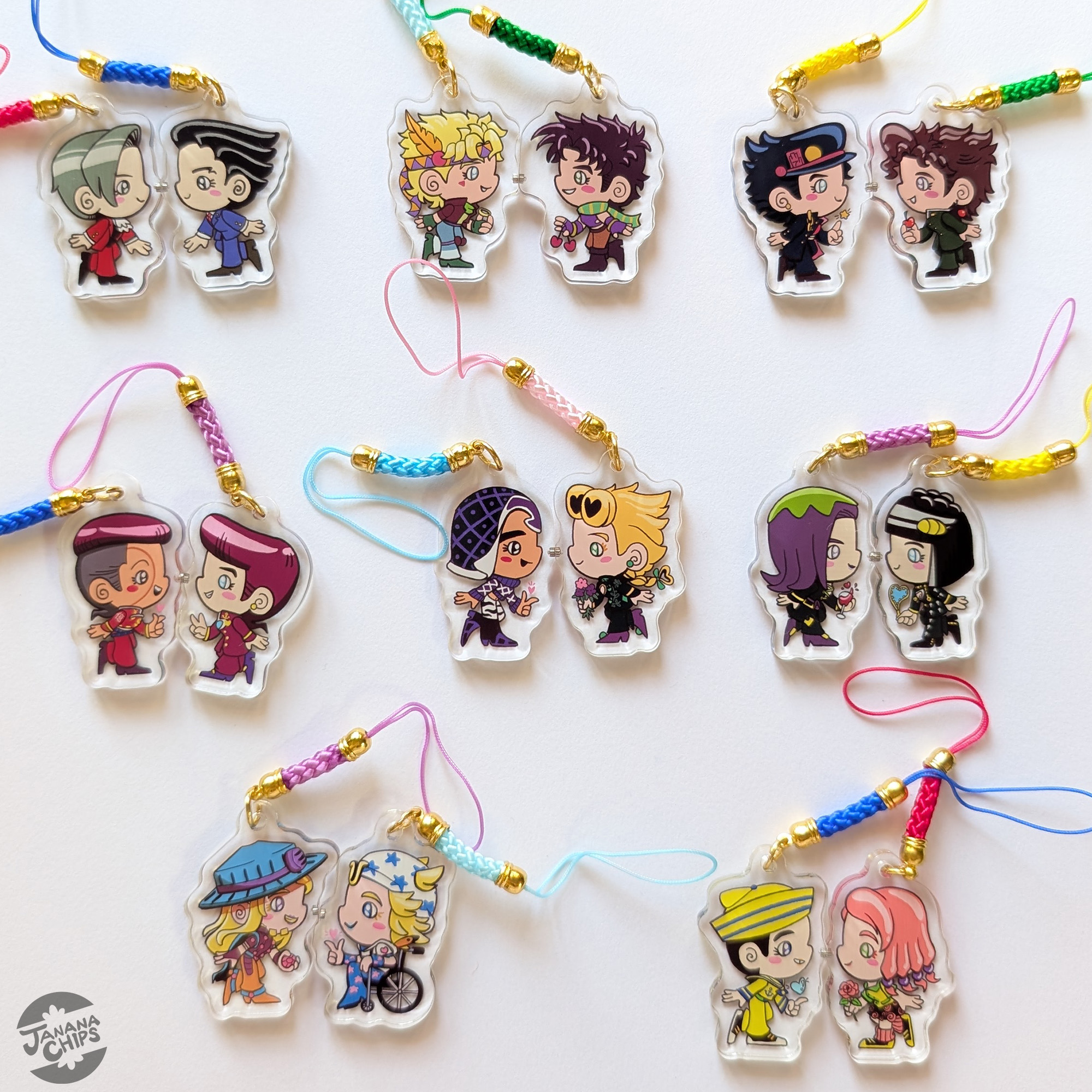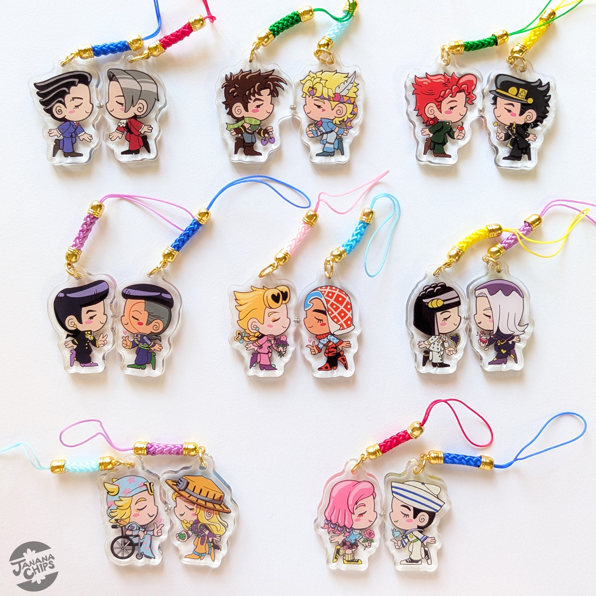 1.5” Acrylic double sided charms with a magnet embedded in front of the character’s mouth (the red dot in the images) so that they can kiss each other! Each character comes as an individual charm.