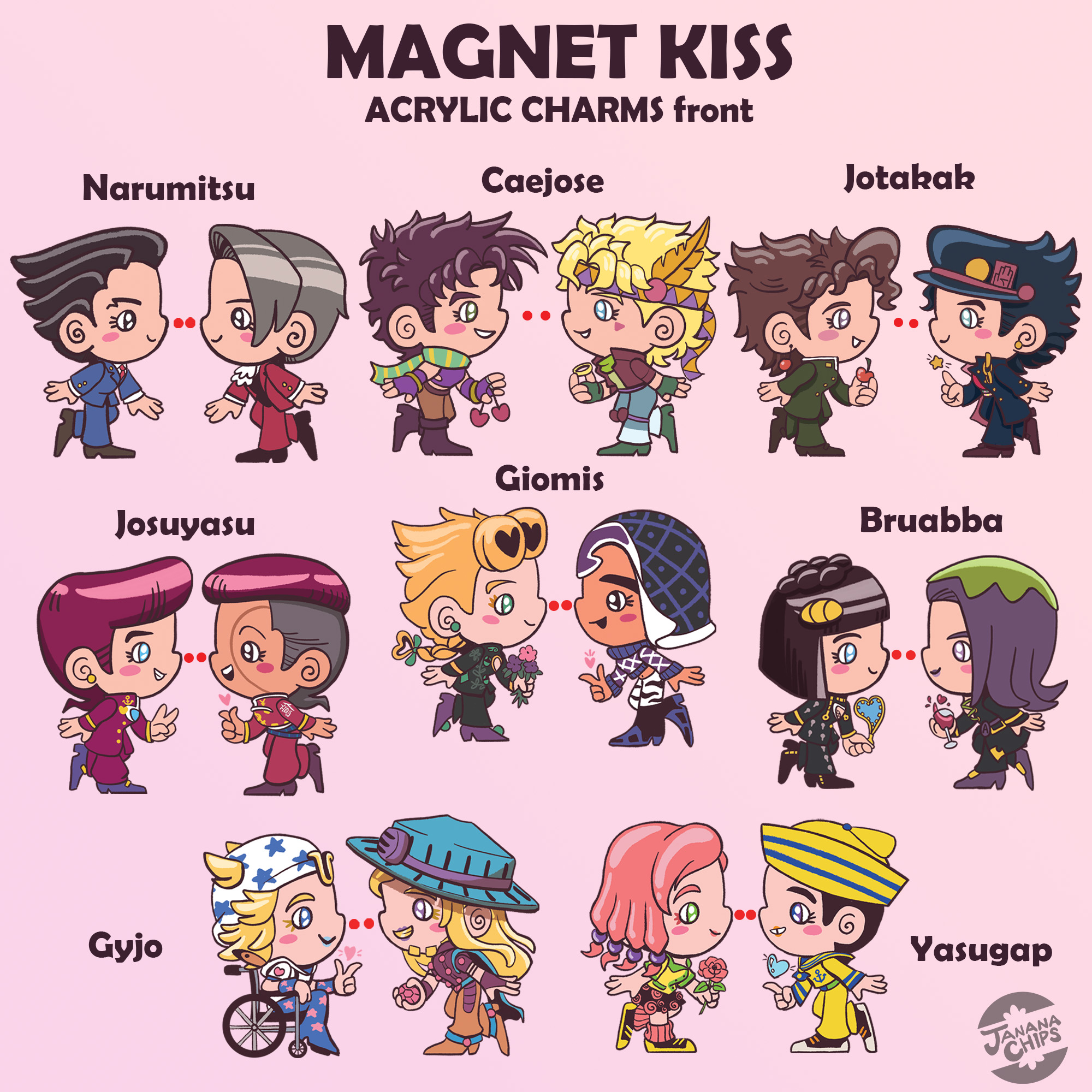 1.5” Acrylic double sided charms with a magnet embedded in front of the character’s mouth (the red dot in the images) so that they can kiss each other! Each character comes as an individual charm, but you must buy them as a set. This is because each magnet has either a north or south pole, and some charms may repel each other. To avoid this, they must be bought in their designated pairings.
