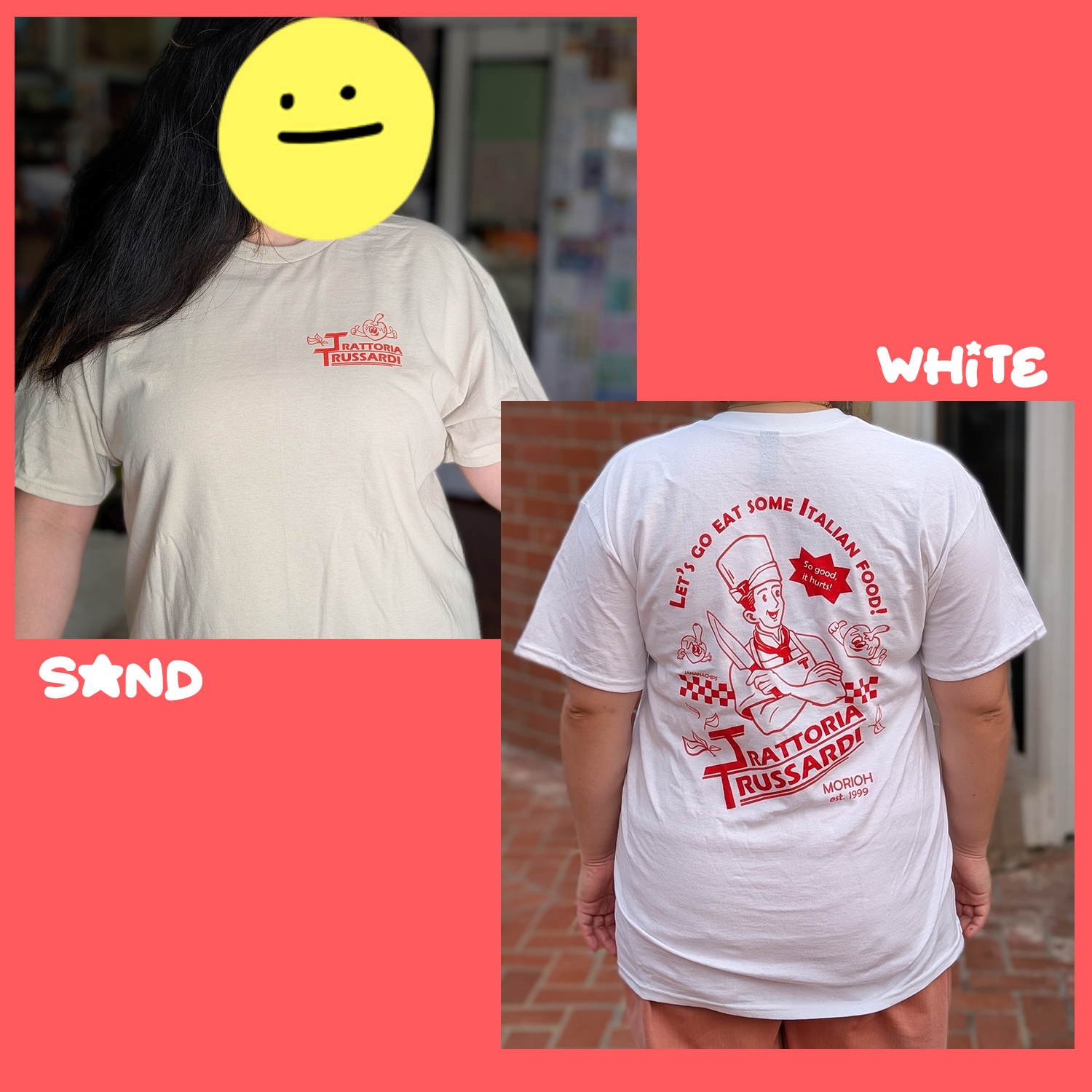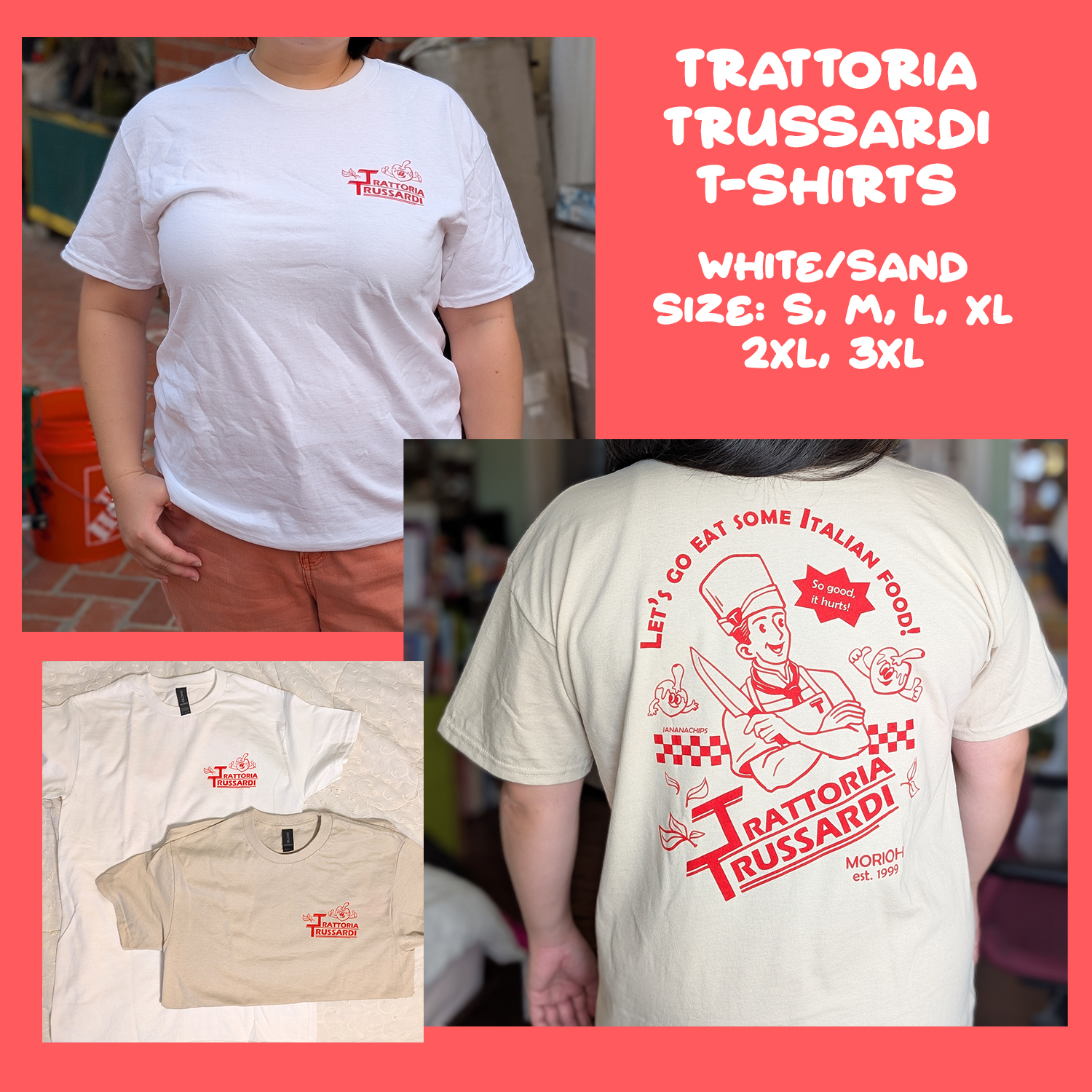 Screen printed t-shirts for Morioh’s best Italian restaurant! Available in-hand for sizes M-3XL in limited numbers of white and sand. Sizes 2XL and 3XL can only be printed in white.